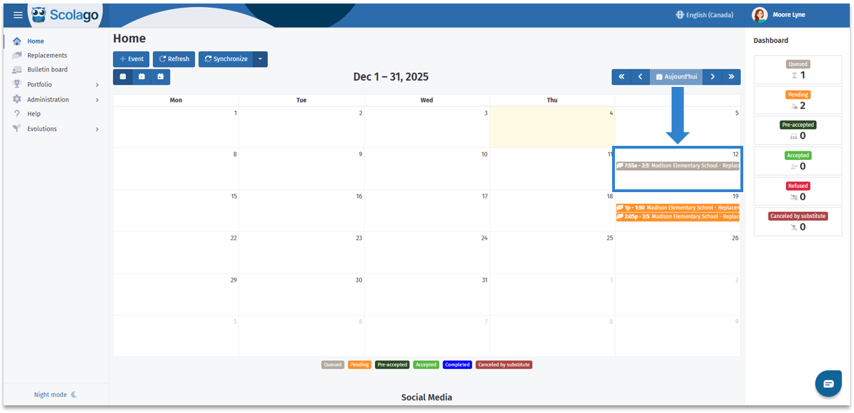 Caution, pre-accepting a remplacement offer does not mean you have been assigned the remplacement. To secure the assignment, you must wait to receive the confirmation email and see the request marked as Accepted in Scolago.