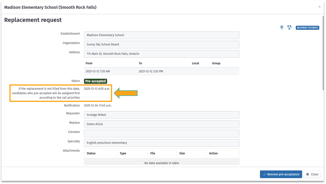 Depending on the settings chosen by your establishments, you might see an additional field in the replacement offer details, specifically the one named If the replacement is not filled as of this date, candidates who have pre-accepted will be assigned in priority according to the call priorities.