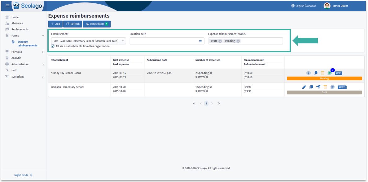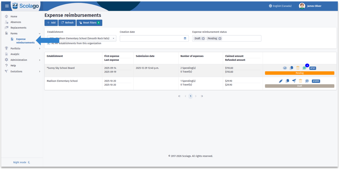 Access the Expense reimbursements module, which is available in the left-hand menu under the Forms section. In this module, a list of your reimbursement requests will appear.