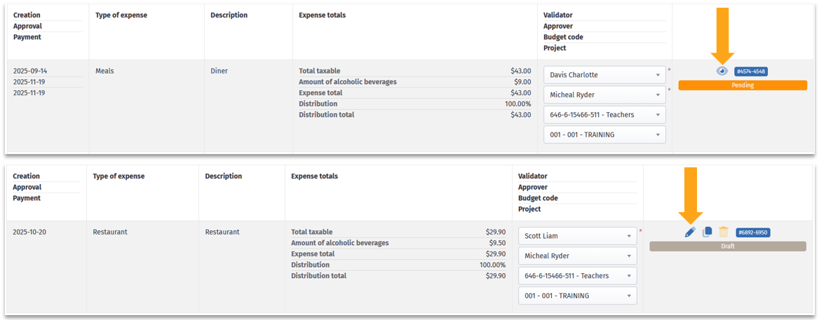 Then, open the relevant expense using the pencil icon or the eye icon, depending on its status.