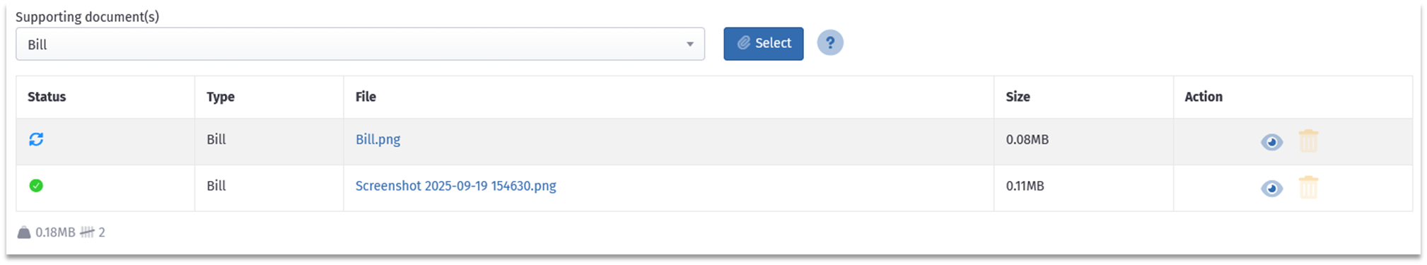 Use the trash icon to delete a supporting document that has already been uploaded. Then, click the Select button to upload a new one.