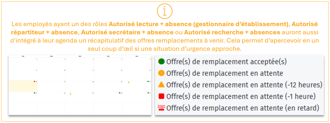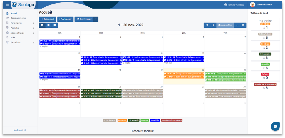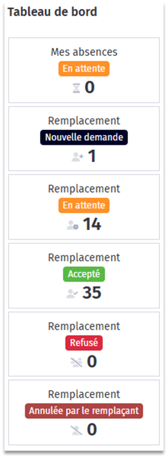 À leur Tableau de bord, les remplaçants voient combien de demandes de remplacement En file d’attente, En attente, Pré-acceptée, Acceptée, Refusée et Annulée par le remplaçant se retrouvent à leur calendrier en date d’aujourd’hui (inclusivement) jusqu’à l’infini.