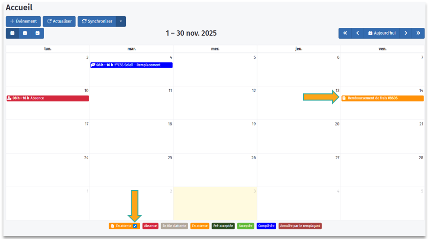Sous le calendrier, une légende vous explique les couleurs des différents événements que vous pouvez voir, quelques-uns sont cliquables : les statuts des remboursements de frais. En cliquant sur un statut de remboursement de frais dans la légende, vous pouvez choisir d’afficher ou non ces informations dans votre calendrier.