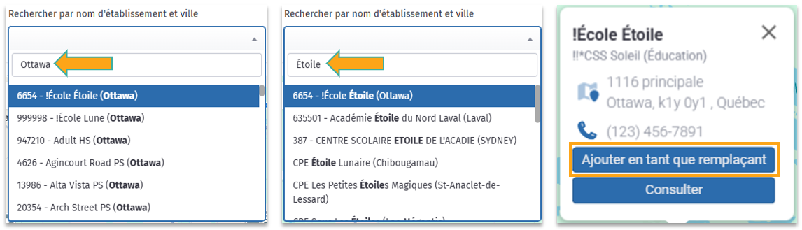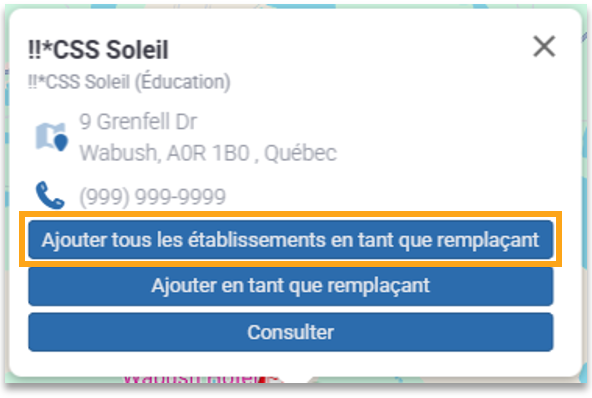 Si vous préférez plutôt vous ajouter à tous les établissements d'une organisation, recherchez l'établissement au nom de l'organisation et cliquez sur le bouton Ajouter tous les établissement en tant que remplaçant.