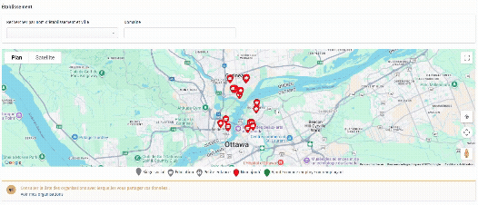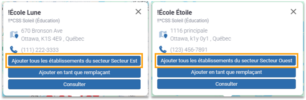 En effet, les établissements d'une organisation peuvent être divisés en secteurs. Cela permet d'ajouter tous les établissements à proximité, peu importe à partir de quel établissement vous effectué votre recherche. Pour ce faire, trouvez un établissement que vous souhaitez ajouter et cliquer sur le bouton Ajouter tous les établissements du secteur.