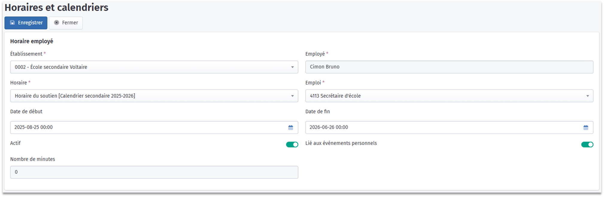 - L'interrupteur Synchronisé est non modifiable : il sera actif seulement pour les horaires employés synchronisés avec le système interne de votre organisation. Dans d'autres mots, si votre organisation n'utilise pas la synchronisation des horaires et calendrier ou que vous créez un horaire employé manuellement, cet interrupteur ne sera jamais actif.