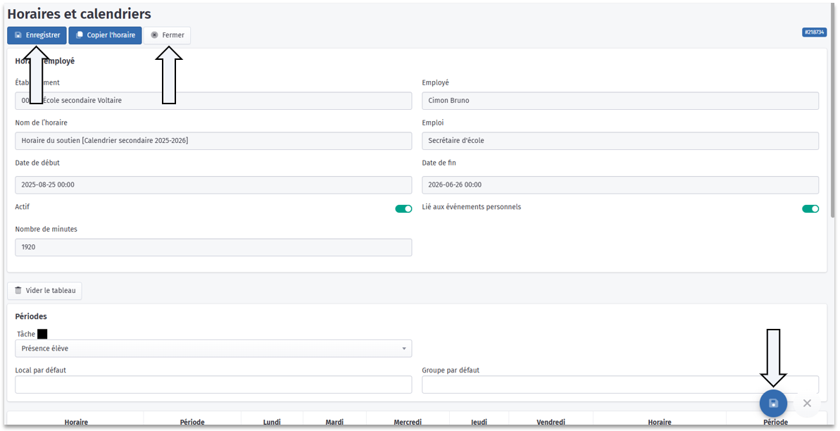Cliquez sur Enregistrer. Une fois que c’est fait, les informations ne sont plus modifiables, mais vous pourrez supprimer l’horaire généré.